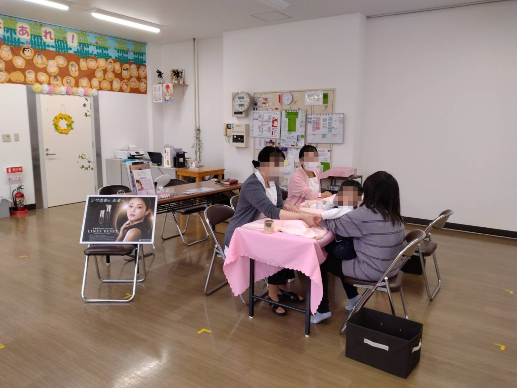 前沢の「メナードフェイシャルサロン オルタンシア」さまにご協力をいただいて、3回目の開催でした。今回も児童クラブ棟内に小さなエステのようなステキなコーナーをつくっていただき、