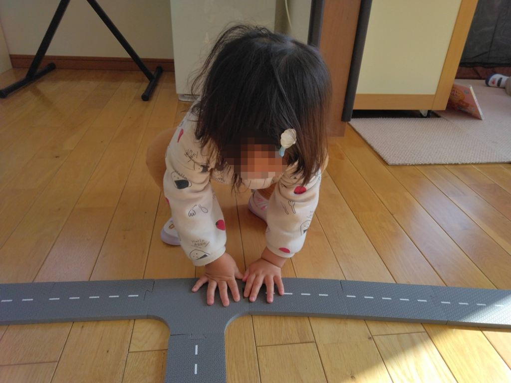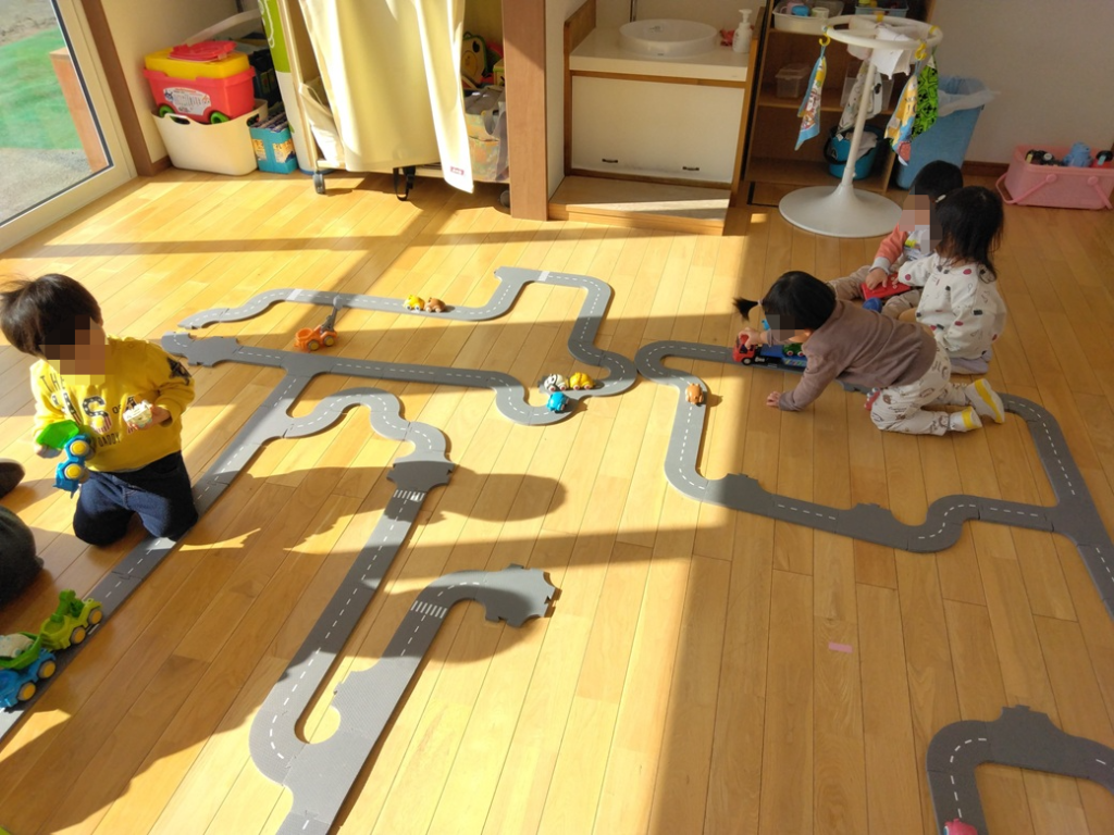 お部屋いっぱいに道路をつくって、車を走らせて遊びました。